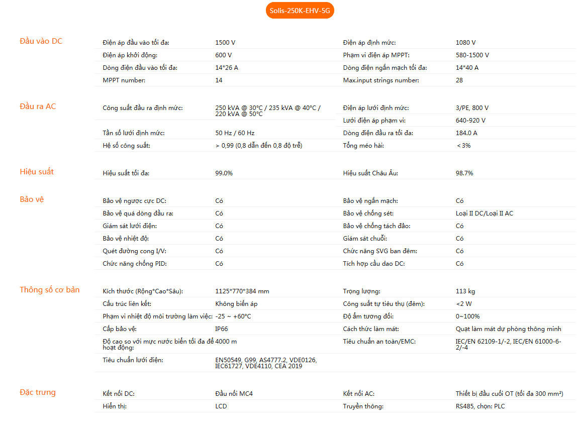 Biến tần chuỗi ba pha 250kW có đầu vào tối đa 28 chuỗi, hỗ trợ kết nối kiểu “Y” ở phía DC. Dòng đầu vào chuỗi tối đa 15A, hỗ trợ truy cập mô-đun hai mặt. Hỗ trợ chức năng chống PID để cải thiện hiệu quả của hệ thống. Giám sát chuỗi thông minh có độ chính xác cao giúp giảm thời gian xác định vị trí lỗi.
