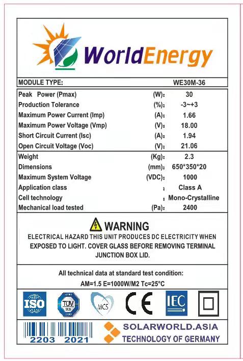 Thông số kỹ thuật TẤM PIN NĂNG LƯỢNG MẶT TRỜI MONO 30W WORLDENERGY