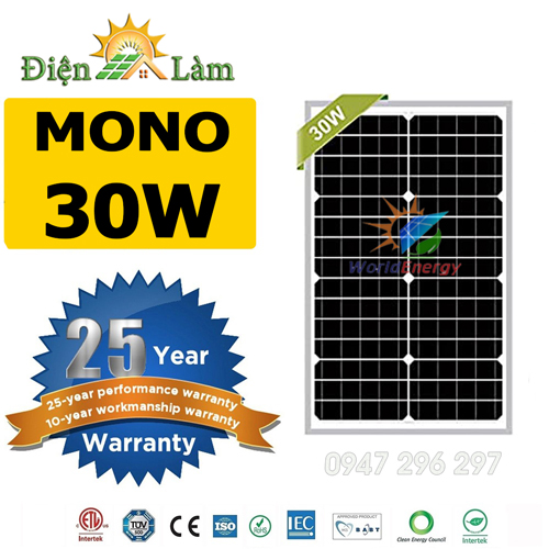 Tấm pin năng lượng mặt trời Mono 30W WorldEnergy (Solar panels) đáp ứng tiêu chuẩn chất lượng nghiêm ngặt của IEC, UL, CE, TUV , ETL, PV Cycle, MCS, BBA, Safety class II. Bảo hành hiệu suất 25 năm để đảm bảo hiệu suất tối đa cho hiệu quả hệ thống cao nhất.