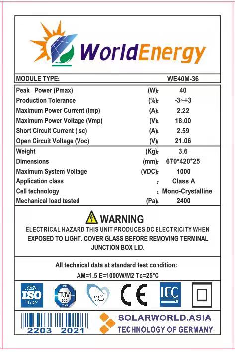 Thông số kỹ thuật TẤM PIN NĂNG LƯỢNG MẶT TRỜI MONO 40W WORLDENERGY